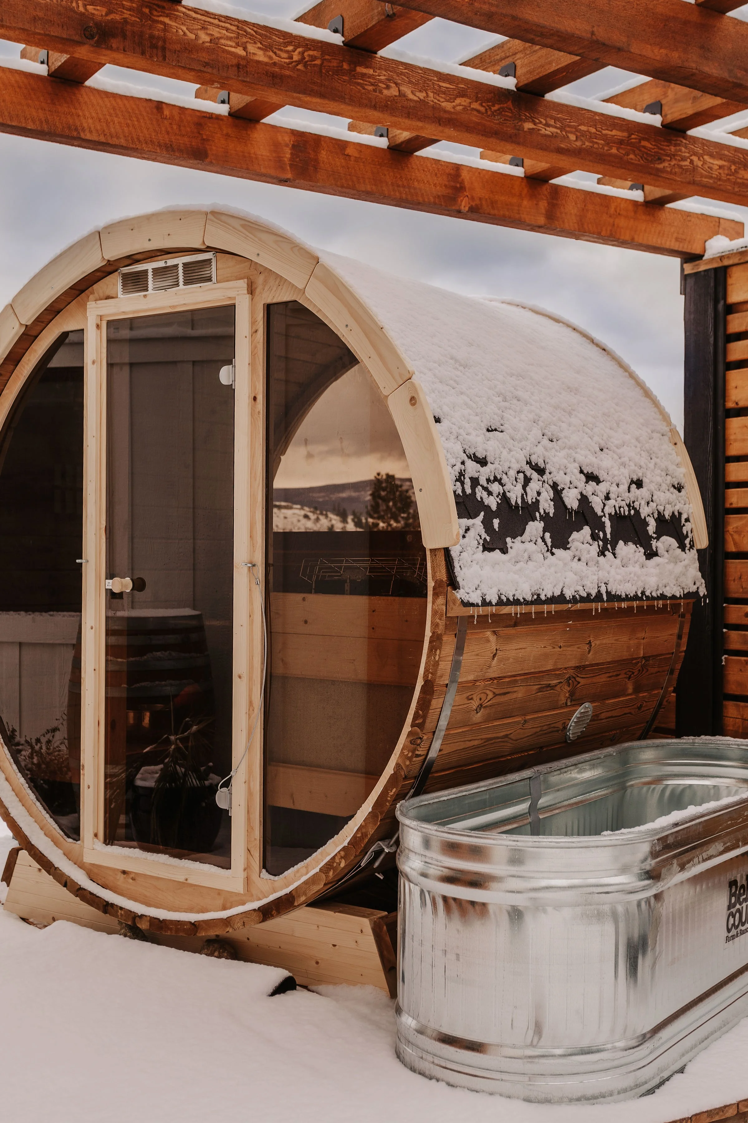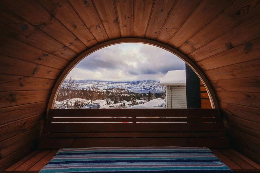 - 2 Person Cedar Barrel Sauna: enjoy the picturesque view from the halfmoon window of the sauna which overlooks the Okanagan Lake and Mission Hill's winery.