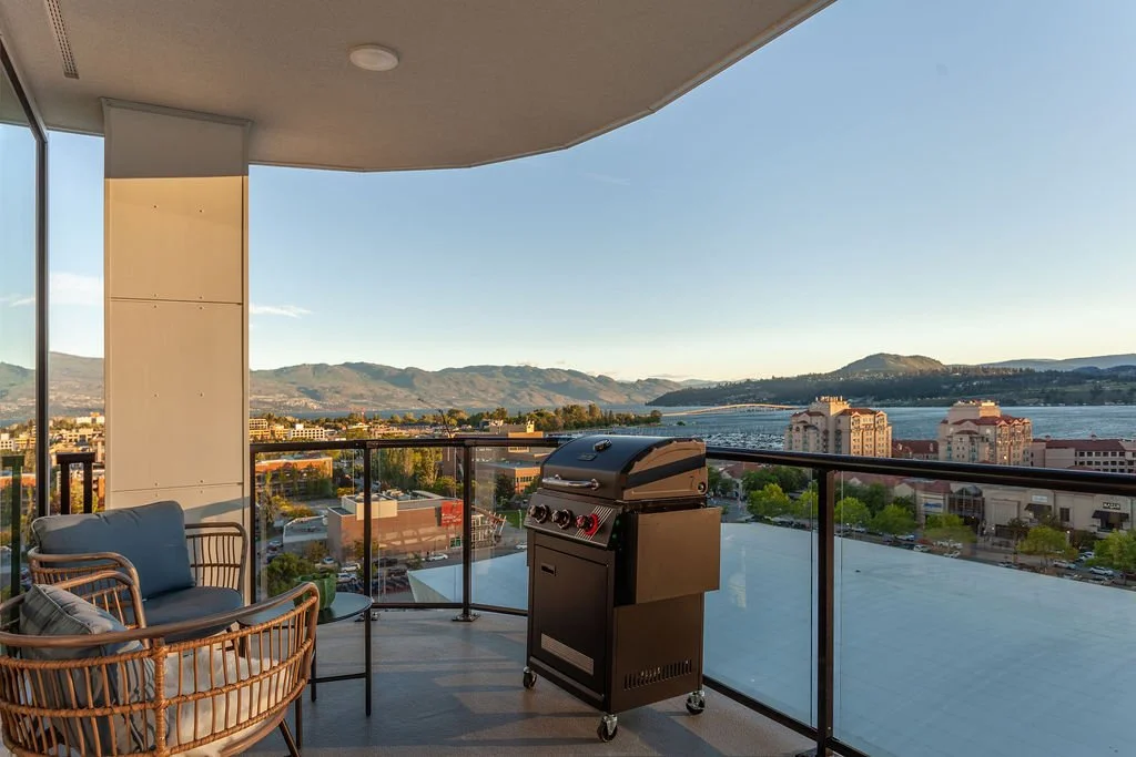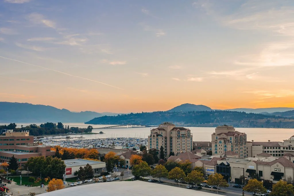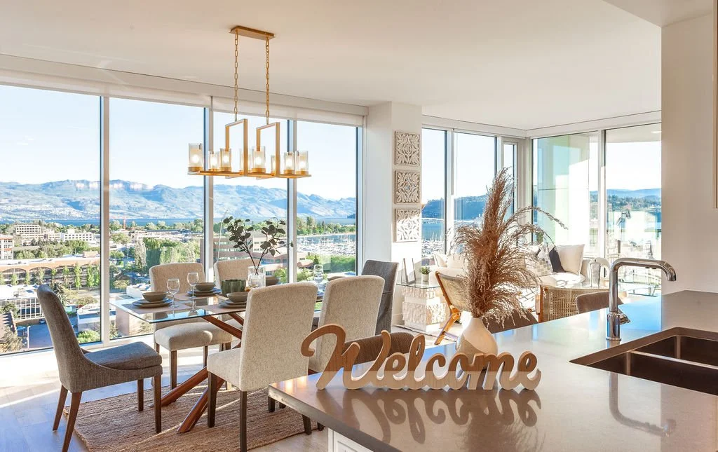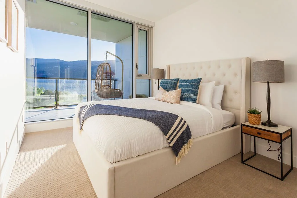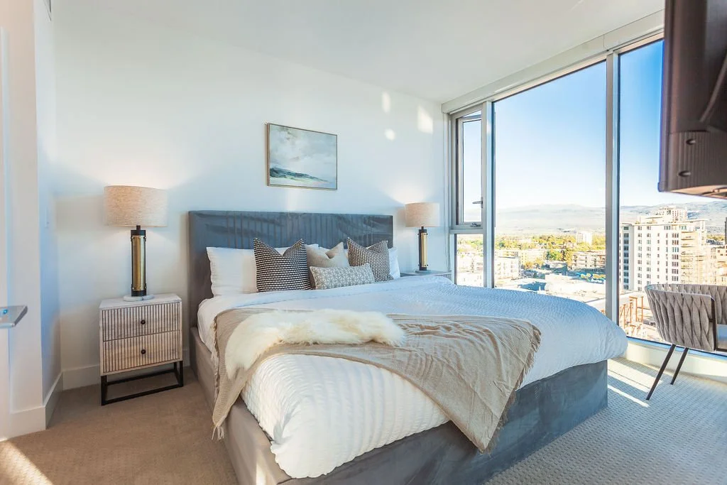 The natural light filled space, with views of mountains and partial views of water, comfortably sleeps 6 and is fitted with AIR CONDITIONING. Perfect for families or corporate travellers looking for a minimum 30 day luggage only move-in ready option. It is walking distance to Waterfront Park and all the shops and restaurants unique to Downtown Kelowna.