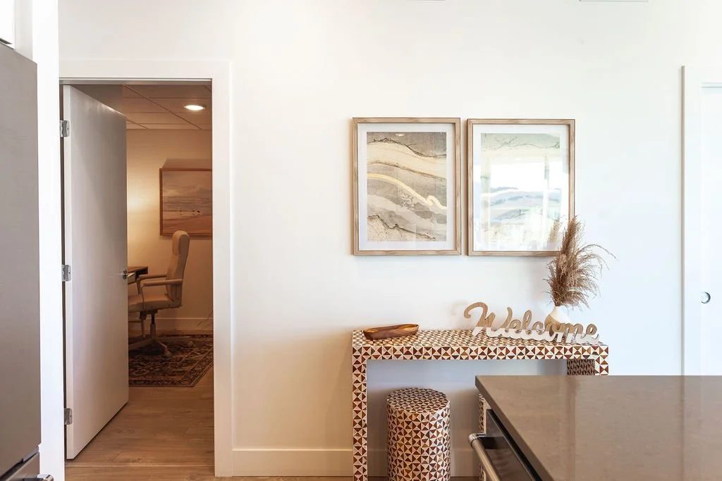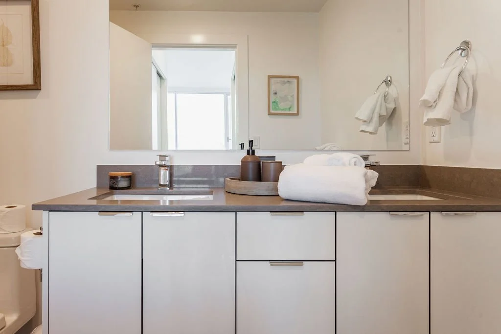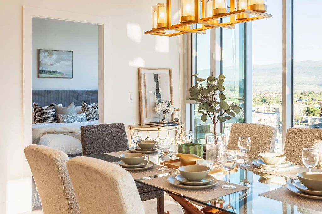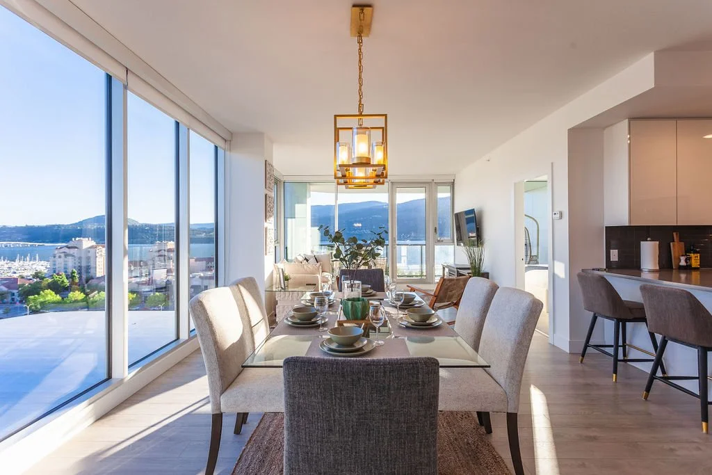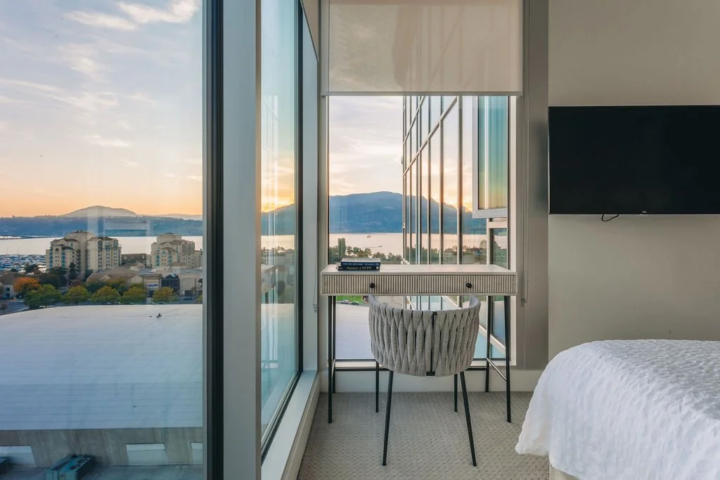 The natural light filled space, with views of mountains and partial views of water, comfortably sleeps 6 and is fitted with AIR CONDITIONING. Perfect for families or corporate travellers looking for a minimum 30 day luggage only move-in ready option. It is walking distance to Waterfront Park and all the shops and restaurants unique to Downtown Kelowna.
