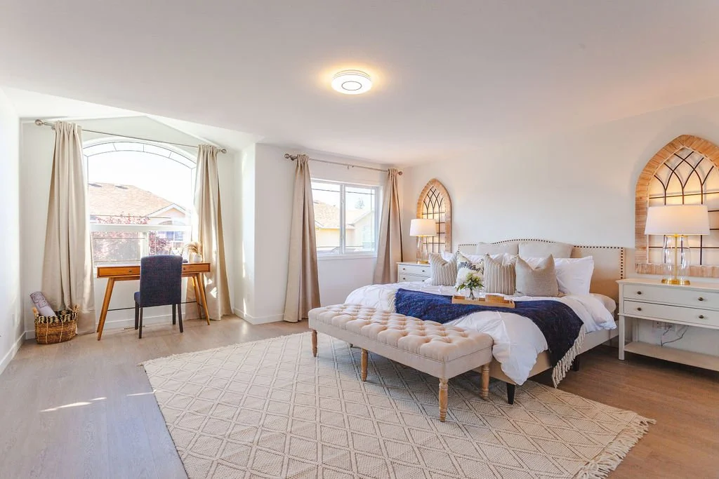 » 主臥室: 提供一張特大床 + 10" 英寸的記憶棉床墊,一台 50" 英寸的智能電視, 和自己的全套衛浴設施